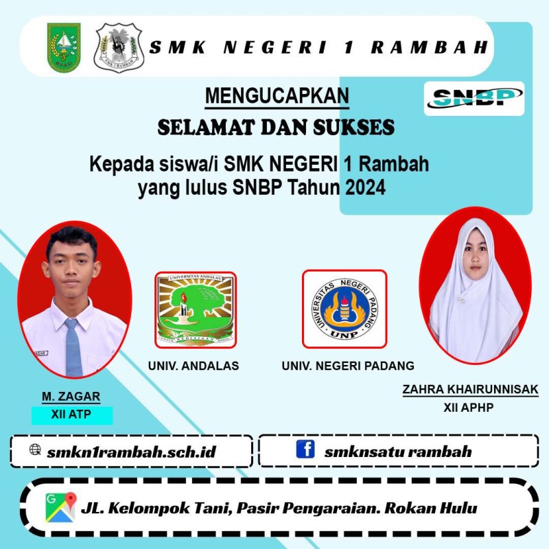 SMK NEGERI 1 RAMBAH, mengucapkan selamat dan sukses kepada siswa/i yang lulus SNBP Tahun 2024. Mari semangat lanjutkan pendidikan !