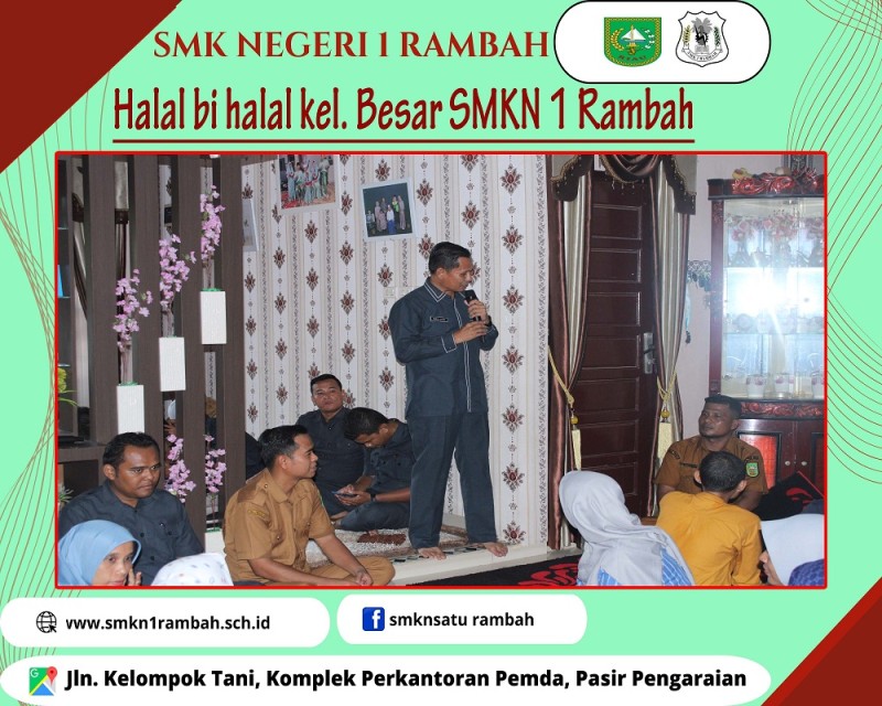 Rangkaian Kegiatan Halal bi halal salam salaman dan maaf-maafan pasca lebaran ied fitri 1445 H. Kegiatan ini di laksanakan di Rumah kediaman Pimpinan sekolah dengan dihadiri seluruh guru dan karyawan SMKN 1 Rambah. Acara ini sekaligus di gandengkan dengan sepatah kata dari guru ASN PPPK yang relokasi ke tempat semula yaitu pak hengki saputra, S.kom dan pak misran, S.Pt. selamat berkiprah di tempat yang semula, semogaa diberikan keberkahan untuk kedepannya !