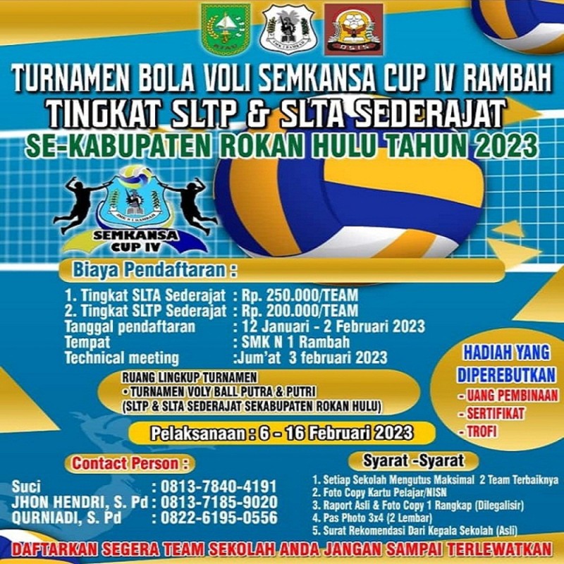 Turnamen Volly Ball SEMKANSA CUP IV RAMBAH TK. SLTP & SLTA SEDERAJAT Se- Kabupaten Rokan Hulu Tahun 2023 segera bergulir..... Ayoo bapak/ibu, kaum sanak saudara.... Segera daftarkan team volly ball sekolah anda masing-masing pada contact person diatas dan jangan sampai terlewatkan !! Pelaksanaan: 6 - 16 Februari 2023. Dan menangkan hadiah beserta tropy penghargaan nyaa..!!
