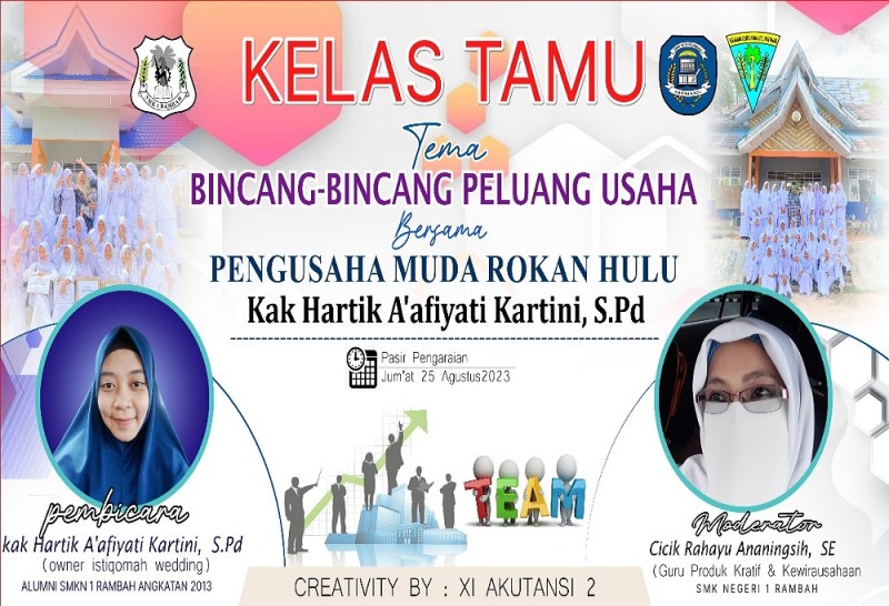 Jum'at, 25 Agustus 2023.. Rangkain kegiatan kelas tamu dengan tema bincang - bincang peluang usaha bersama pengusaha muda Rokan Hulu bersama sdri. Hartik A'afiyati Kartini, S.Pd ( alumni SMKN 1 Rambah 2013 ) berjalan dengan lancar. Banyak ilmu yang di dapatkan dalam kesempatan ini. semoga memberikan manfaat dan keberkahan. aamiin.
