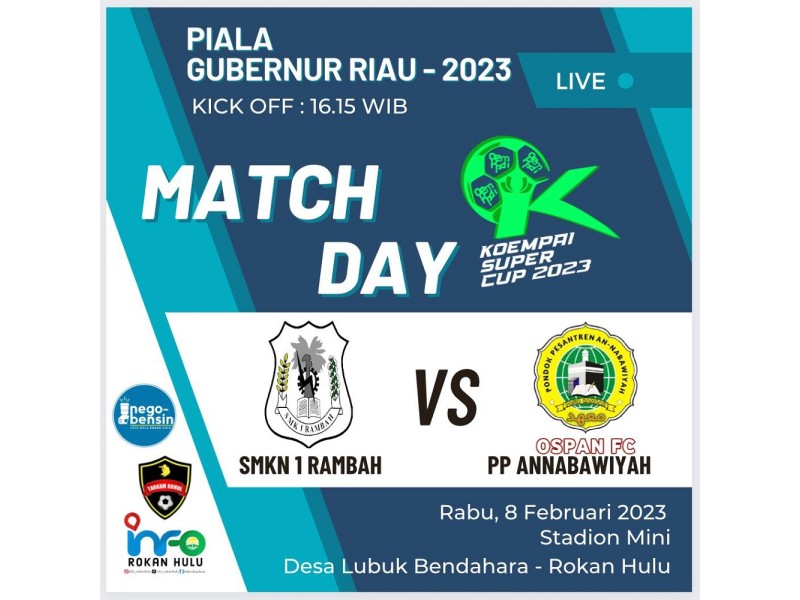 Mari kita support team sepak bola SMKN 1 Rambah di tournamen Piala Gubernur Riau Th. 2023, Koempai Super Cup 2023 di Stadion Mini Lubuk Bendahara, Kec. Rokan IV Koto, Kab. Rokan Hulu. ...