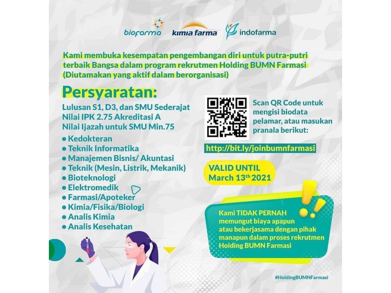 Asalamualaikum wr.wb. berikut kami menginformasikan bahwa berikut ini ada kesempatan pengembangan diri untuk putra-putri terbaik bangsa untuk program retkruitmen holding BUMN farmasi ( diutamakan yang aktif dalam berorganisasi ) ...