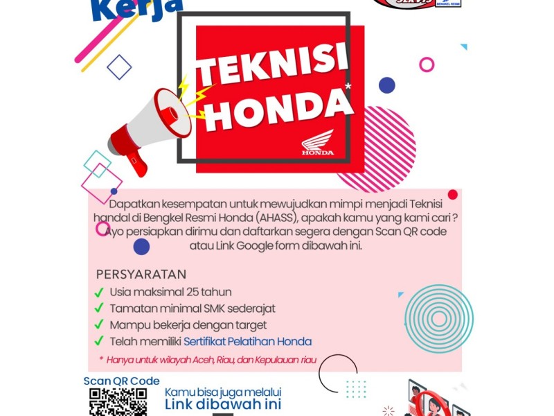 kami dari SMK NEGERI 1 RAMBAH meluncurkan informasi seputar kesempatan kerja di bidang teknisi honda. Semoga bermanfaat ...