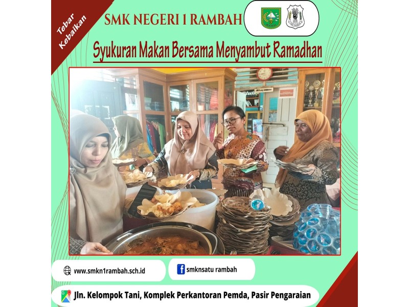Alhamdulillah, telah terlaksana syukuran makan bersama dalam menyambut bulan ramadan 1445 H. Semoga dengan tebarnya kebaikan ini selalu mengeratkan silaturrahmi antar seluruh guru SMKN 1 Rambah. marhaban ya ramadan .. ...