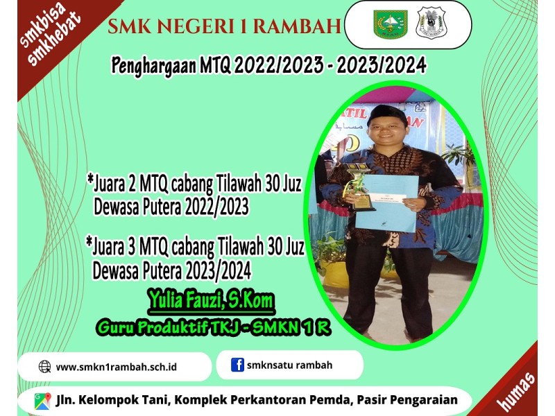late post. senin - selasa 05 - 06 Februari 2024. Alhamdulillah, salah seorang guru kita bapak Yulia Fauzi, S.Kom ( Guru produktif TKJ SMKN 1 Rambah ) dipercaya mengikuti MTQ Tk. ROKAN IV Koto. dari 40 peserta dengan cabang tilawah,...