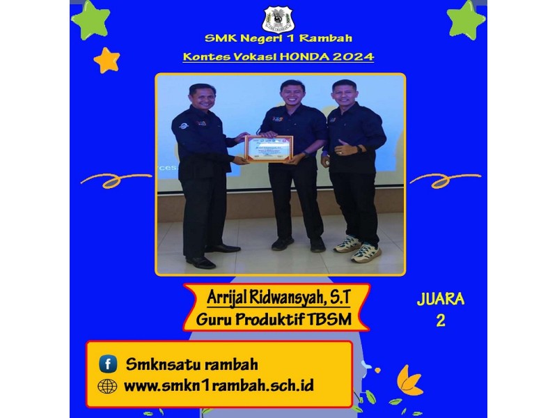 Rabu, 28 Februari 2024. Alhamdulillah, Kita dari SMKN 1 Rambah mengikuti kontes vokasi honda 2024 di Pekanbaru dan hasilnya memuaskan yaitu guru dan siswa yang menjadi utusan mendapatkan juara. selamat kepada guru kita bapak Arrijal Ridwansyah, S.T ( Juara 2...